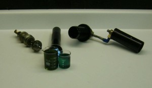 This is the first time this shock has ever been taken apart. The beaker on the left contains most of the 5 weight Silkolene shock oil as it came out of the shock. The beaker on the right contains new 5 weight Silkolene shock oil for comparison.