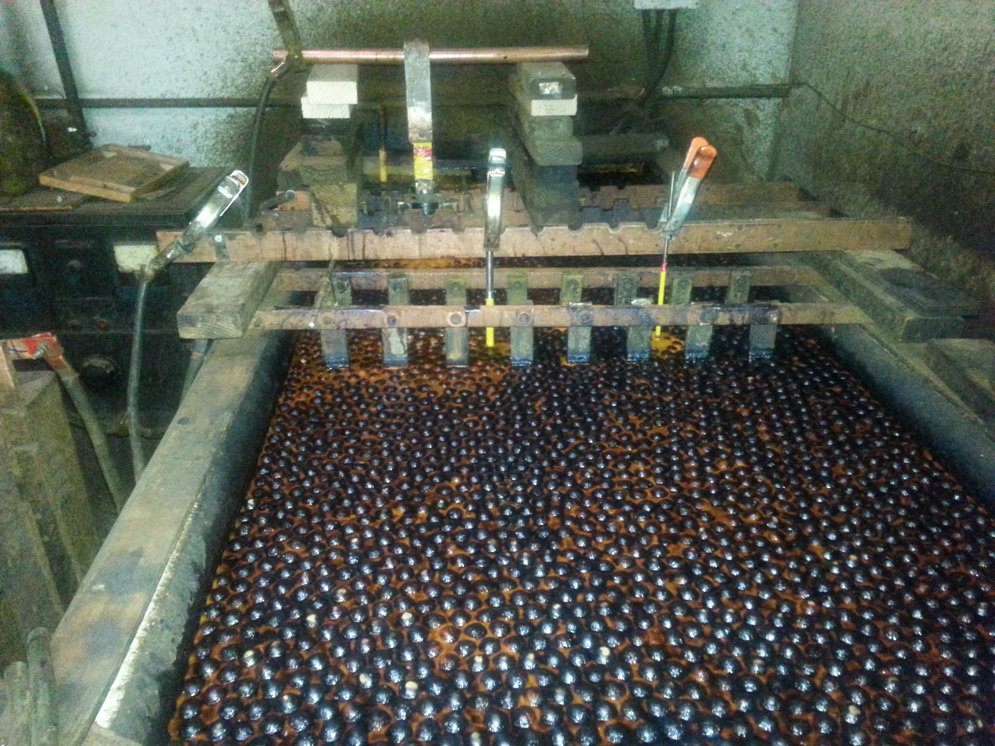 Step two is applying the new chrome by electroplating in this big tank: The balls floating on top help keep bad stuff from getting into the air.