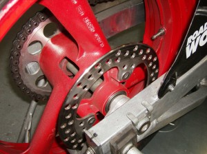 Check out the rear rotor on my ‘90 TZ250. The counter sunk screws weigh less than the stock bolts and give more space when changing wheels. The stock holes have been enlarged. The outside edge of the rotor has been rounded to fit between the pads easy.