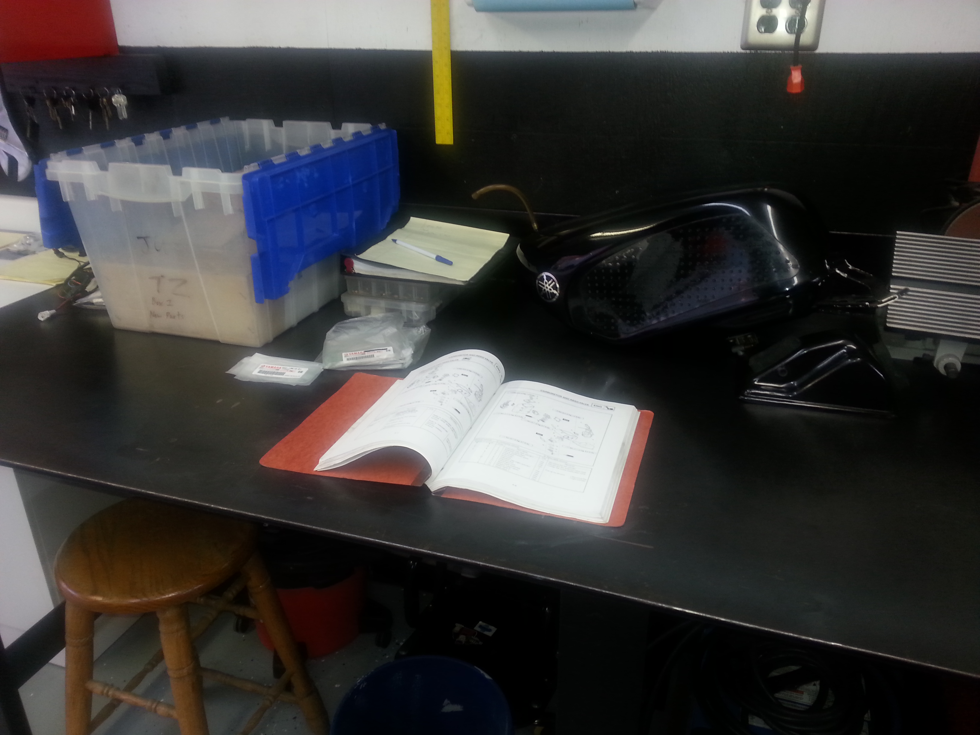 Manual by LE | Nov 13, 2014 | Lindemann Engineering I’ve been working on TZ250’s since 1992. You might think that by now I would not need the manual. I don’t, but why take a chance. Also notice the note book and pen.