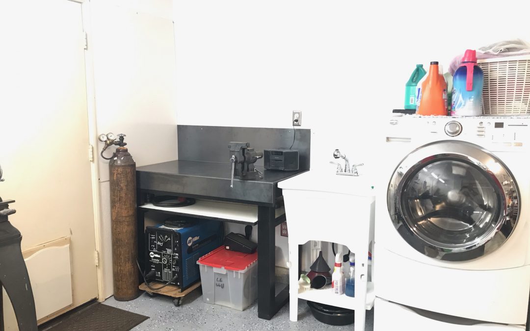 Welding Table and Sink. I painted this part of the floor, added wiring and plumbing, then replaced and painted the drywall. The table is covered with 1/8 thick steel and mounted to the floor and wall. Next step is to cut a board to cover the sink for extra work space. When not in use the board will live between the sink and washer. The pull out faucet reaches the swamp cooler that parks in front the the table. Still to do: shelf for the radio, hang LED light over the work space, trophy shelf, above washer & dryer. Then it will be time to paint the rest of the floor.