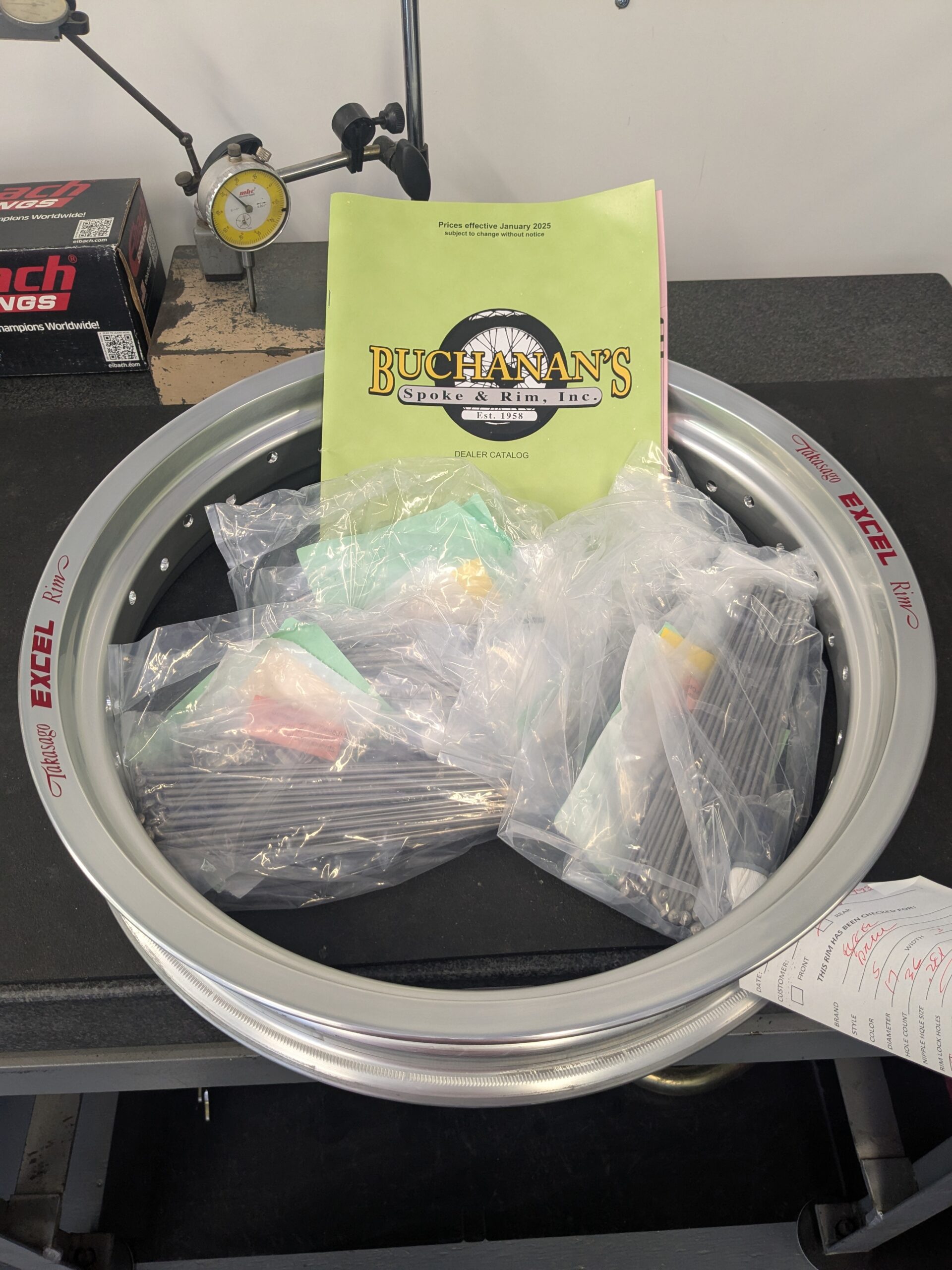 I built my first wheel in 1984 using Buchanan’s spokes. I swapped the steel 19′ & 18′ rims of my ’76 CB550F race bike for wider 18′ aluminum rims. Latter I built a 16′ front using longer forks from a CB900F. Now it’s time to build some 17’s for the TTR125LE’s.