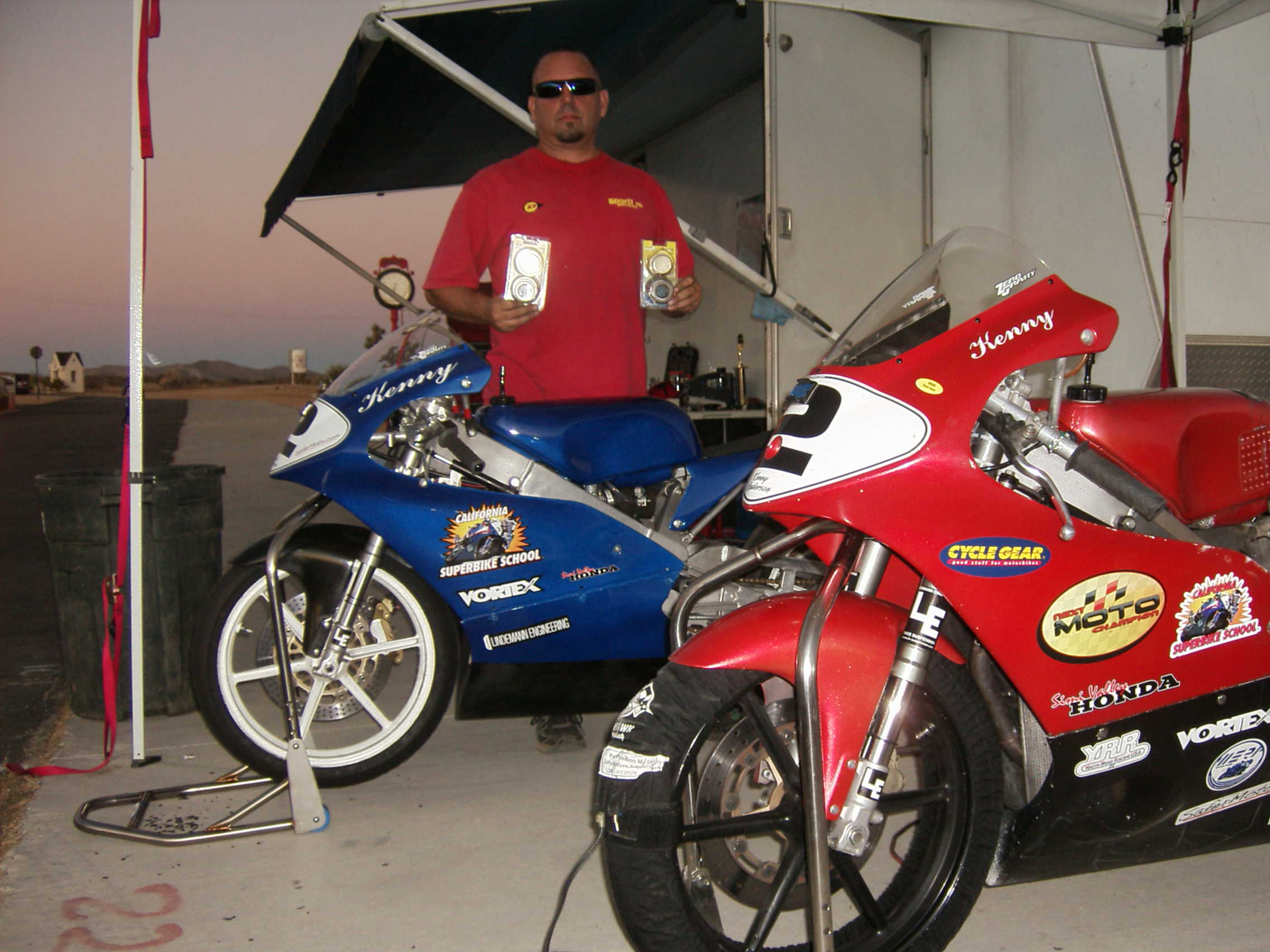 Eric and the Bearings by LE | Oct 9, 2011 | Lindemann Engineering Last we saw Race Dad, Eric working under his trailer. Here we see him with his spare trailer bearings. This guy learns well! Note the Lindemann Engineering stickers on the forks of both Kenny’s race bikes.